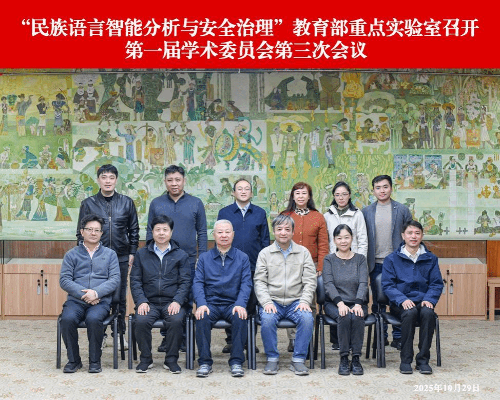 2025 年 10 月 29 日下午,“民族语言智能分析与安全治理”教育部重点实验室第一届学术委员会第三次会议在中央民族大学海淀校区中慧楼一层会议室召开。中央民族大学党委常委、副校长甘明刚,科研处副处长陈笑出席会议。中国科学院李树深院士、欧洲科学院院士清华大学孙茂松教授、北京理工大学陶然教授、清华大学刘洋教授、中国人民大学杜小勇教授、北京邮电大学杜军平教授、北京航空航天大学童咏盺教授以及中央民族大学毕晓君教授和翁彧教授等 9 位学术委员会委员参加此次会议。